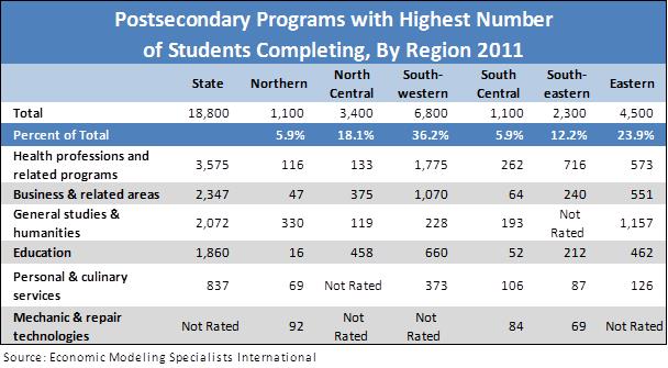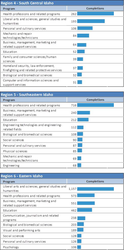 Health care programs had the most completers statewide and were at or near the top in all six regions in 2011. Business programs ranked second statewide with the significant participation in southwestern Idaho offsetting comparably lower showings in some other regions.