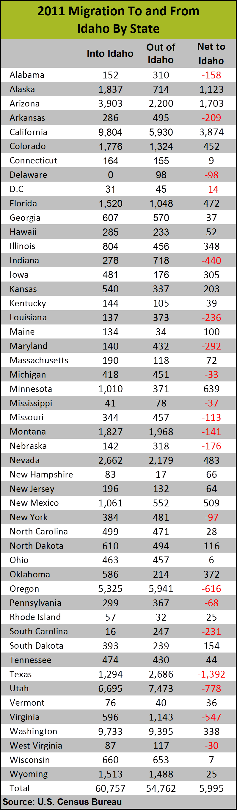 The Census Bureau five-year estimates showed migration in both directions between Idaho and every state but Delaware in 2009, 2010 and 2011.