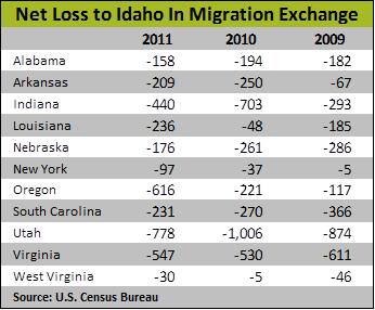 The new 2011 census figures, for the first time, included estimates of educational attainment and annual income for those moving in and out. In Idaho, those moving into the state were a little more prosperous than those moving out but a little less educated, on a percentage basis.