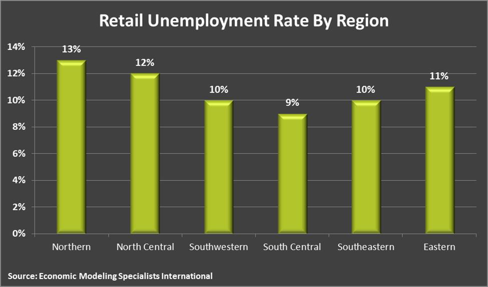 Unemployment for retail during the second quarter of 2014 was at 11 percent, with high retail unemployment in all six regions of the state. Employment in the retail sector fell from 83,300 in 2007 to 77,500 in 2013.
