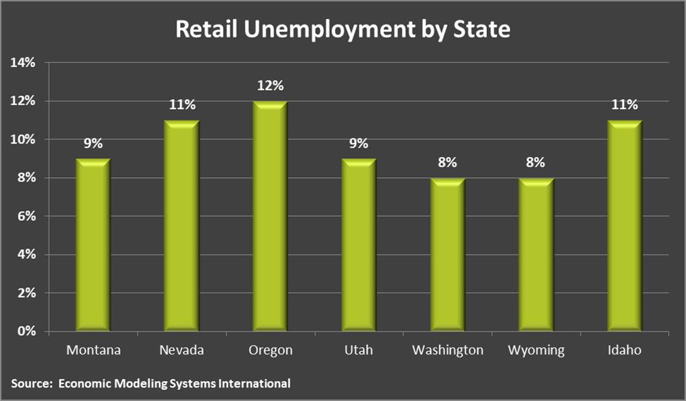 Idaho is not alone in high unemployment in the retail industry. Nationally, unemployment rate for retail trade is 10 percent, only one point lower than the Idaho rate. Neighboring states likewise struggle to provide employment opportunities for workers with experience in retail sales.