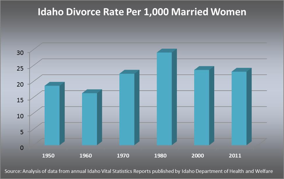 In Idaho, the divorce rate showed a similar pattern. Because Idahoans tend to marry younger and there are proportionately more young adults in the Idaho population, Idaho’s divorce rate is somewhat higher than the nation’s since younger people are more likely to get divorces.