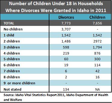 In 2011, 7,773 divorces were granted to residents of Idaho, according to the Idaho Department of Health and Welfare’s vital statistics report. The median duration of a marriage that ended in divorce that year was 6.3 years. About 37.1 percent lasted less than five years while 13.2 percent lasted more than 20 years.