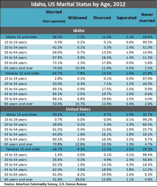 In 2009, according to the American Community Survey, the median age of an Idahoan who had divorced in the previous 12 months was 40.3 while the median age of an Idahoan who had married in the previous 12 months was 26.5.