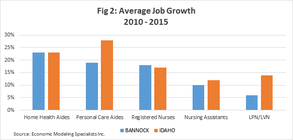 Although there is a higher concentration of lower skilled aides in Bannock County than in the nation, their growth rate is only slightly above the national growth rate. Statewide, aide occupations are losing ground when compared with national growth rates. By contrast, nurses and nursing assistants show growth trends that significantly outpace national growth trends.
