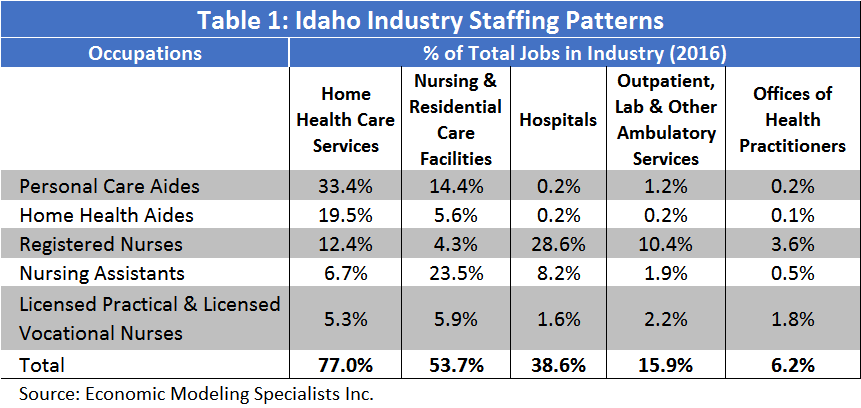 Nurses, nursing assistants, personal care and home health aides make up a 77 percent of the home health care workforce. By contrast, these jobs make up less than 10 percent of total employment in the category of offices of health practitioners. A breakdown of the staffing patterns of the five major health care groupings is shown in the Table 1.