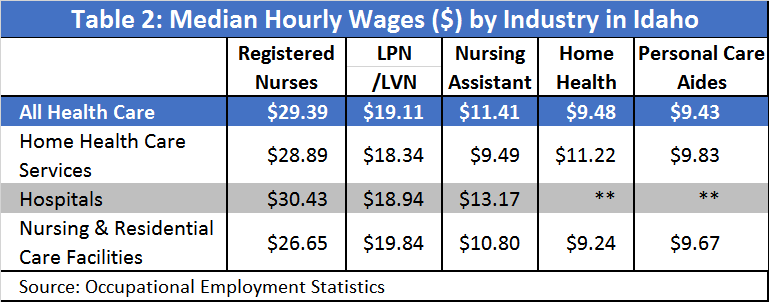 An added component of the low wage dilemma is that wages in much of home health care — and the entire health care industry sector — are tied to preset reimbursements from Medicaid and Medicare, further constraining the ability of the industry group to provide a competitive wage or expect to hire skilled talent. Reports from the Idaho Department of Health and Welfare show that while cap limits for skilled nursing have increased, limits for home health aides in the state of Idaho remain significantly below pre-recession highs. In addition, hourly reimbursement rates for personal care and attendant care services remain low at less than $16 per hour.