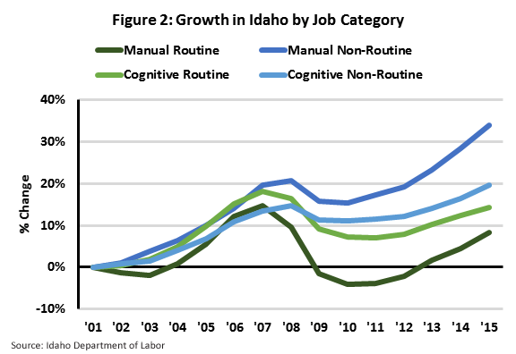 The Department of Labor’s long-term employment projections suggest these trends will continue. Based on the latest projections, which forecast Idaho employment through 2024, growth in non-routine jobs, both manual and cognitive, will continue to outpace the growth of routine occupations. In fact, these projections may overestimate the growth of routine jobs. Because the department’s projections do not attempt to predict future technological change, these forecasts will not capture the numerous cases where new technology and automation strategies further replace the need for workers in routine occupations.
