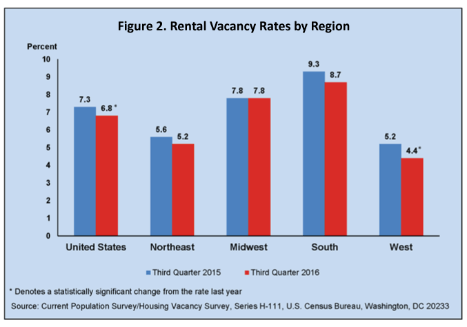 As the economy has recovered, most of the barriers to home buying that were present early on after the recession have been overcome. Lending standards and job insecurities have relaxed while unemployment has dropped and incomes are upward bound. However, availability of rental housing is still low. In 2016, the United States rental vacancy rate was 6.8 percent – still down almost 4 percent from pre-recession rates – and the West has the lowest vacancy rate in the nation at 4.4 percent (Figure 2).