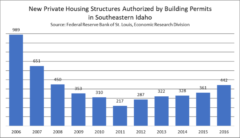 With Idaho as the fastest-growing state in the region, construction employment is expected to continue this growth trajectory. Construction permits, an indicator of future industry growth, are showing a gradual recovery. New housing structures authorized by building permits have increased 37 percent since 2013 to 442 – fewer than half the permits issued pre-recession. According to preliminary estimates, there were 203 permits for single-family homes in the Pocatello metro area alone, up 150 percent from a 2011 trough where only 81 permits were issued. But it is still lagging behind the 629 building permits of 2006.